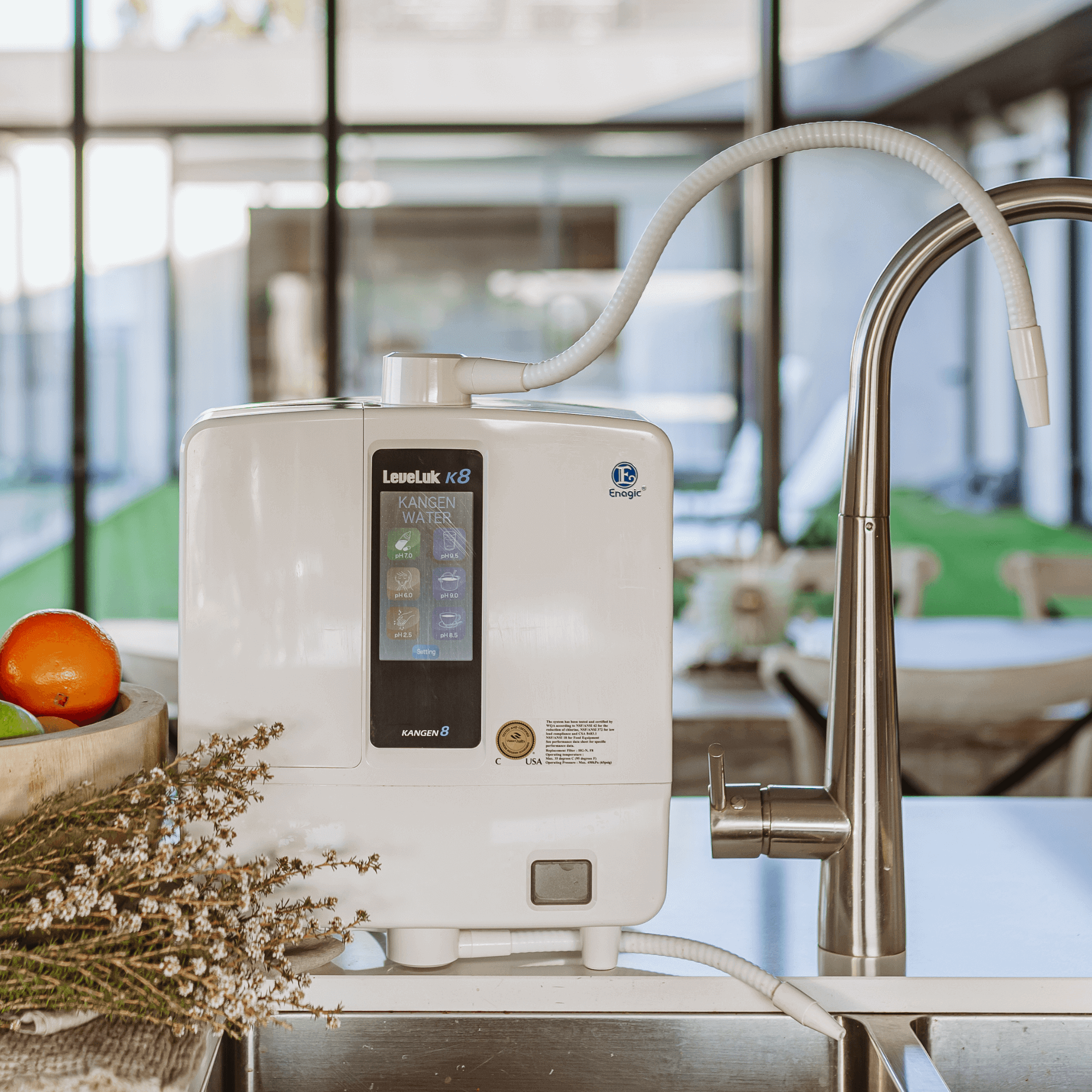 The K8 is extremely user-friendly, thanks to a large full colour LCD panel and clear voice prompts. With just a touch of a button, you can have access to any of the 5 waters you choose. Your machine will confirm the water you have selected with a pleasant voice (she speaks 8 languages), and in moments the machine will generate ionised water through a flexible pipe.